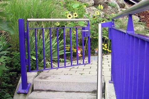 Staketengeländer mit Chrom-Nickelstahlhandlauf und passender Drehtür als Abschluss.